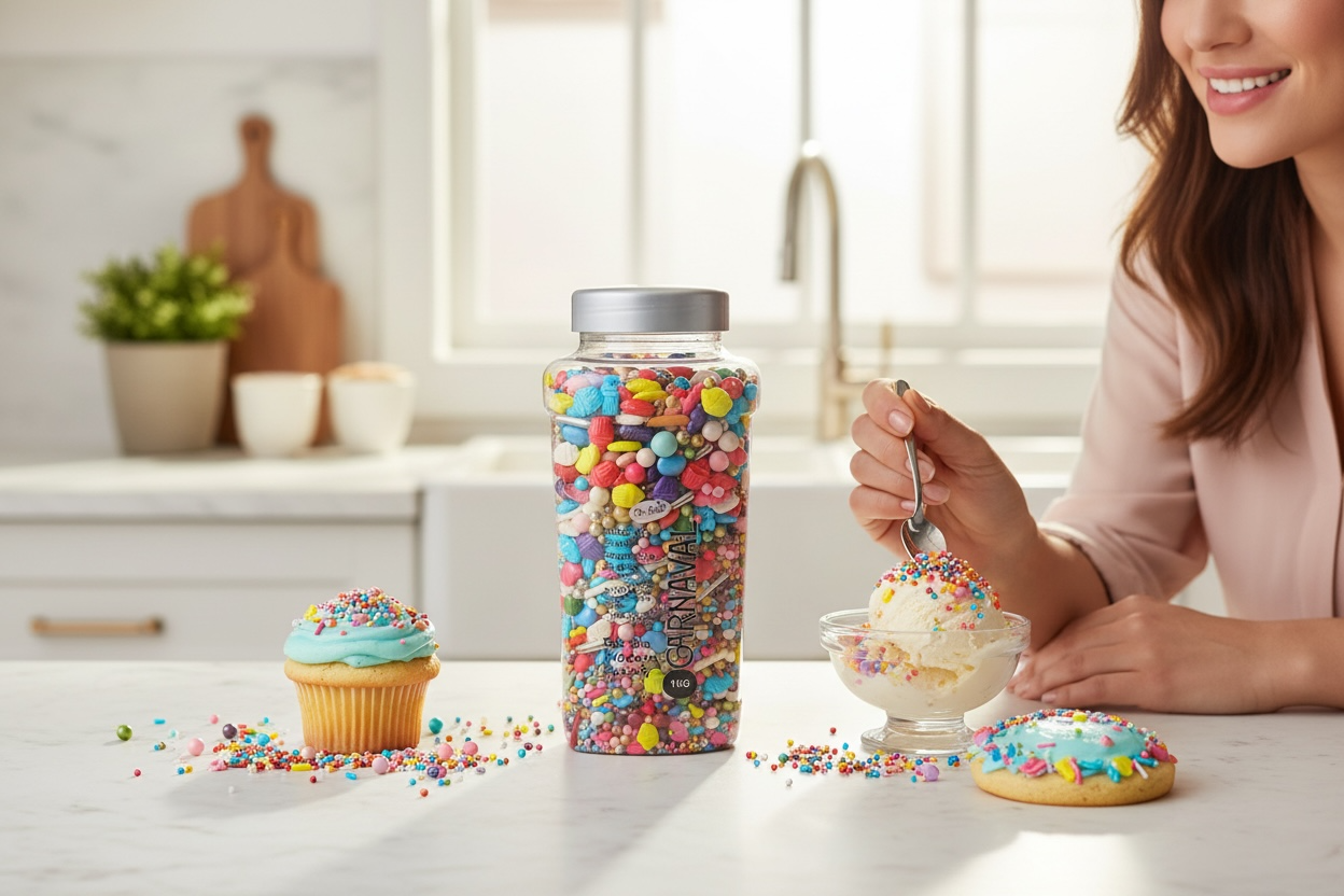 Dr. Gusto Karnaval Şeker, pastacılık ve tatlı dekorasyonu için geliştirilmiş yenilebilir süsleme karışımıdır. Pasta, cupcake, muffin, kurabiye, truf, cake pop ve özel sunumlarda profesyonel bir görünüm elde etmek isteyen kullanıcılar için idealdir. Farklı şekillerden oluşan yapısıyla tatlılara hacim, doku ve dikkat çekici bir görünüm kazandırır. Ürün fırınlama gerektirmez; krema, şanti, ganaj, buttercream, çikolata kaplamalar ve dondurma gibi birçok yüzeyde formunu korur ve kolayca uygulanır.